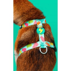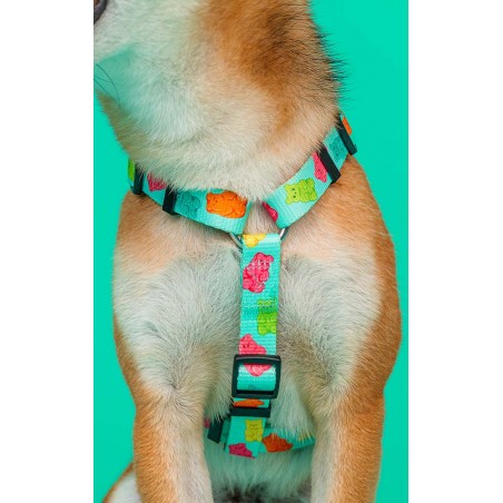El arnés para los perrretes más dulces con un color azul pastel de base y dibujitos de ositos de gominola de colores.