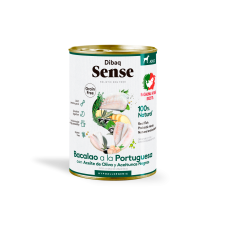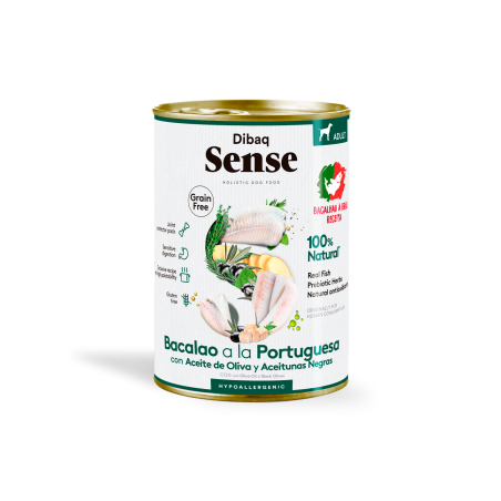 Este alimento húmedo completo Sense Bacalao a la Portuguesa es una exquisited, elaborado con pescado real apto en origen para consumo humano.
