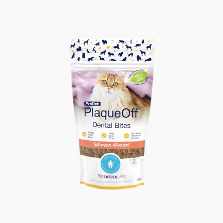 Dental Bites para gatos está disponible en presentación de 60g con un sabroso sabor a Salmón elaborado exclusivamente para los felinos.