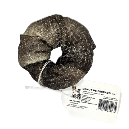 Snack natural para perros a base de piel de pescado desecado y enrollado en forma de donut.